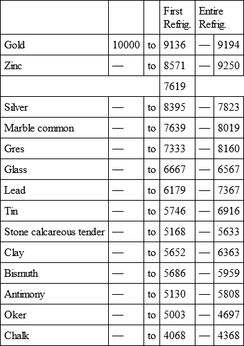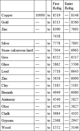 This fact was neither known to chemists nor naturalists; they did not even imagine that gold which is more than twice as dense as iron, nevertheless loses its heat near a third sooner. It is the same with lead, silver, and copper, which are all more dense than iron, and which, like gold, heat and cool more readily; for though the object of this, second memoir was only refrigeration, yet the experiments of the one that preceded it demonstrate, that there is ingress and egress of heat in bodies, and that those which receive it most quickly also lose it the soonest.