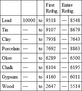 4thly, That the time of refrigeration of iron to that of lead, so as to be held in the hand, is:: 531/2: 27 and 142: 941/2 for their entire refrigeration.