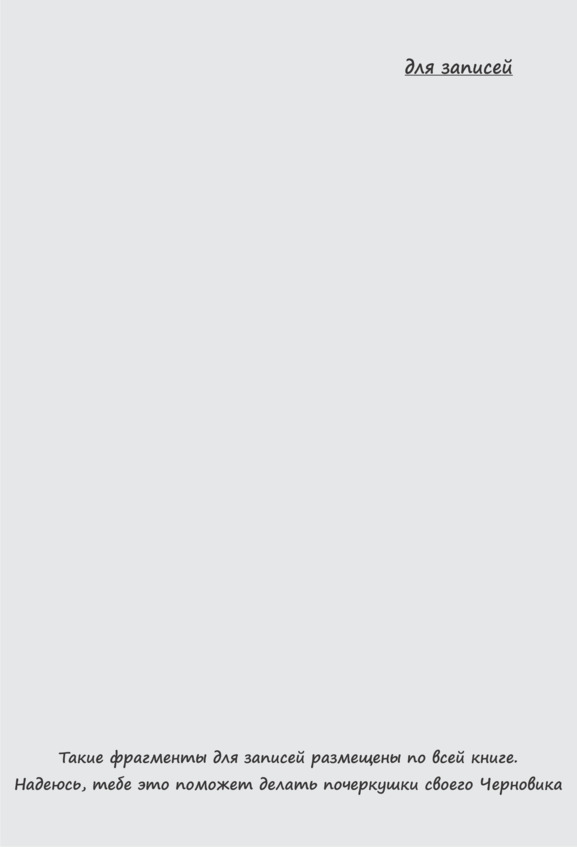 Во время чтения этой книги тебе пригодится большая тетрадь, или листы формата A4, или новый файл в компьютере. Но специально для тебя я буду оставлять пустые строчки, чтобы ты мог в своей тетради или в компьютере писать уже начисто, а в напечатанной книге пусть будет твой черновик, твоя бесценная рабочая книга записей, почеркушек на полях и между строк. К черновикам у меня особая любовь – они несут твою самую первую, необработанную мысль и её энергию, и оттого ценны. А когда мы встретимся, я с удовольствием полистаю нашу с тобой книгу, твой черновик.