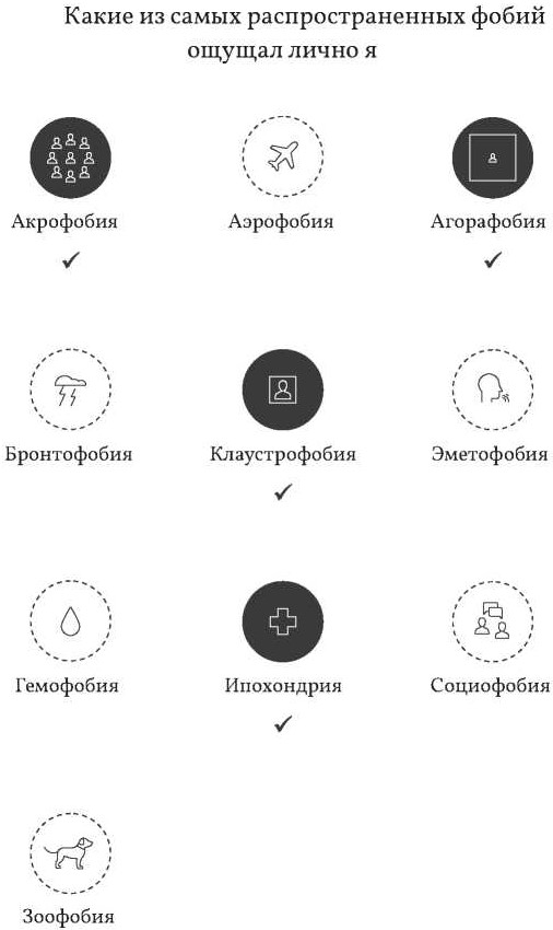 Шансы, что фобия реализуется в реальной жизни и приведет к смертельному исходу, весьма незначительны – ибо проблема именно в страхе, появившемся случайно или вследствие чего-либо. В этом смысле не имеет значения, у какой из них больше причин возникнуть – у бронтофобии (боязни грома) или аэрофобии (боязни самолетов), а может быть, у агорафобии (боязни открытых и общественных пространств) или эметофобии (боязнь рвоты), где риск смерти приближается к нулю. Фобии – это не вопрос рассудка или здравого смысла: разберите их по косточкам, поставьте во главу угла (женщина, которая боится бананов, или мужчина, впадающий в столбняк при виде спрута) и узнайте их значение – это не изменит их наличие или отсутствие, не поможет с ними справиться (только облегчит их расшифровку).