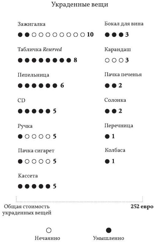 (3) Когда я познакомился со своей женой, Е., у нас появился своего рода ритуал – воровать в ресторанах или барах, куда мы захаживали, вещи, почти ничего не стоившие, за кражу которых не предусмотрены были какие-либо серьезные последствия (таблички с надписью Reserved, стоявшие на столиках пепельницы, перечницы, солонки, меню). Это было для нас вроде игры, чтобы добавить жизни яркости.
