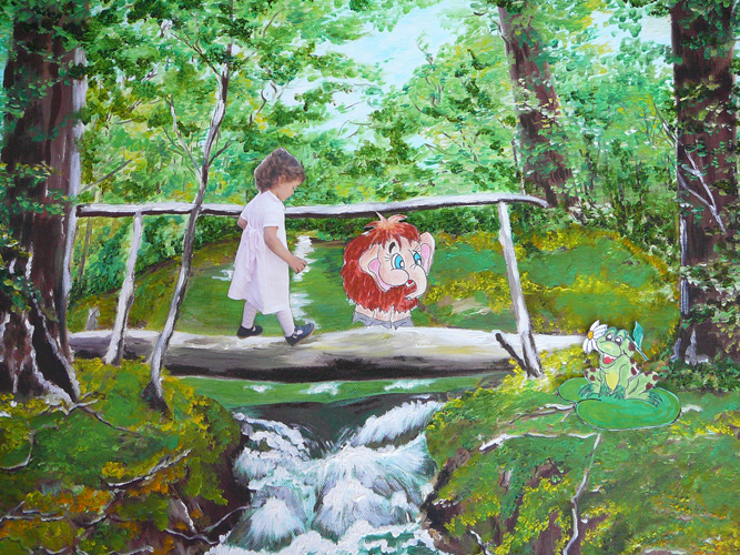 Снаути и Мишель поблагодарили Черепаху и радостно побежали вниз, вдоль ручья, и вскоре услышали доносившиеся откуда-то из-за зарослей папоротника плеск воды и громкое кваканье.