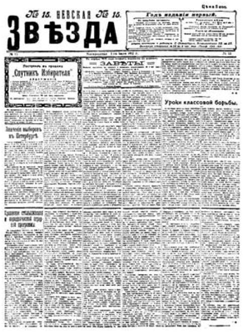 Первая страница газеты «Невская Звезда» № 15, 1 июля 1912 г. со статьями В. И. Ленина «Значение выборов в Петербурге» и «Сравнение столыпинской и народнической аграрной программы» (Уменьшено)