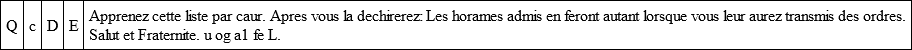 Persons at that time on the scent of this discovery did not learn till a later date the meaning of the four capitals, —Quinturions, Centurions, Décurions, and Éclaireurs, or the sense of the letters u og a¹ fe, which were a date, and indicated "this 15th April, 1832." Under each capital letter were written names followed by very characteristic remarks. Thus, "Q. Bannerel, 8 guns, 83 cartridges. A safe man. – C. Boubière, 1 pistol, 40 cartridges. – D. Rollet, 1 foil, 1 pistol, 1 lb. gunpowder. – E. Tessin, 1 sabre, 1 cartouche-box. Punctual. – Terreur, 8 guns. Brave," etc. Lastly, this carpenter found in the same enclosure a third paper, on which was written in pencil, but very legibly, this enigmatical list.