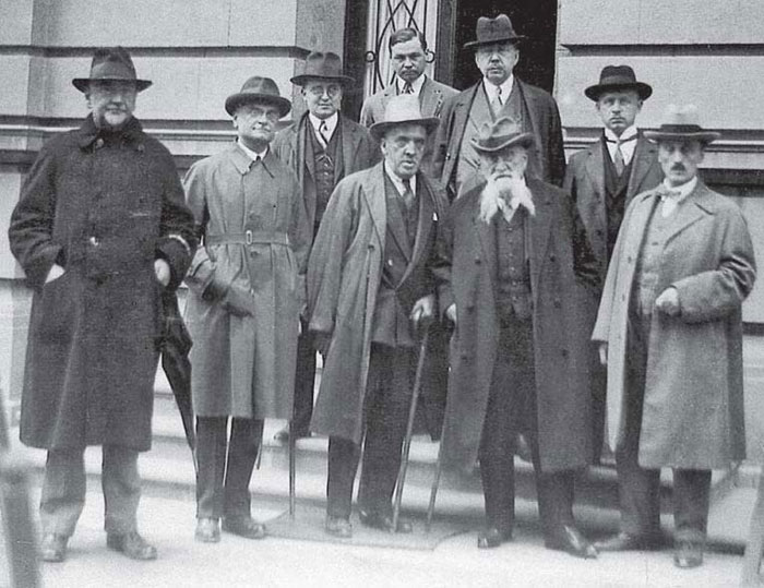 Группа русских литераторов после приема королем Югославии Александром I. Белград, октябрь 1928 г. Слева направо: В первом ряду: М. Н. Могилянский,?. А. И. Ксюнин. Вас. В. Немирович-Данченко. Б. К. Зайцев. Во втором ряду: Жуков,? В. Ф. Зеелер, А. А. Боголепов.