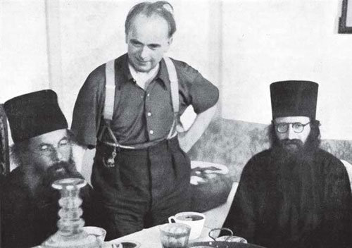 Архимандрит Кассиан Безобразов, о. Василий Кривошеин и один из немецких исследователей. Фото из книги: «Mu¨nchsland Athos». Mu¨nchen, 1945. S. 231.