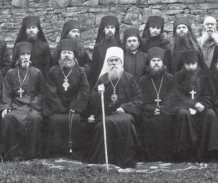 Братия Типографского монашеского братства в Ладомировой, в Словакии, перед зданием типографского корпуса в дни визита Первоиерарха Русской Зарубежной Церкви. Начало сентября 1940 г. Первый ряд (слева направо): игумен Филимон (Никитин), АРХИМАНДРИТ Серафим (Иванов, настоятель), Митрополит Анастасий (Грибановский), архимандрит Нафанаил (Львов), игумен Савва (Струве). Второй ряд: монах Вячеслав, монах Григорий (Пыжов), монах Виталий (Устинов), иеромонах Герман, монах Сергий (Ромберг), инок Афанасий, А. П. Белонин.