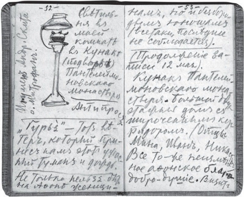 Кунак Пантелеймоновского монастыря. Большой двухэтажный дом с широченным коридором. (Отцы Мина, Иван, Никанор [?]. Все то же неизменное афонское благо-добро-душие. Визит // [54] к начальнику полиции – ведет меня отец Иван – рыжеватый, полнощекий, быстро-говорящий монах. Начальника нет. Заходим в (кафе!) Картина в нем: волки гонятся за уносящейся тройкой, последний винокур, виды Афонской горы, и др.[угие] Возвращаемся. Меня проводят наверх. Во втором этаже // [55] парадные комнаты для приезжающих, большая как бы аванзала с удивительными часами, циферблат и маятник которых сплошь в разноцветных камешков [sic!]. На огромной крытой стеклянной галерее, выступающей из стен дома, диваны, фотографии, стол с букетом чудных роз. Виден сад и кусты роз в нем. // [56] Мне отводят комнату с тремя постелями. О. Мина седоватый южанин из под Херсона, приносит завтрак: суп из риса, довольно вкусный, и рыбу со стручками – это невыносимо и несъедобно.