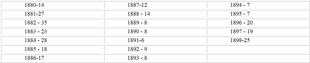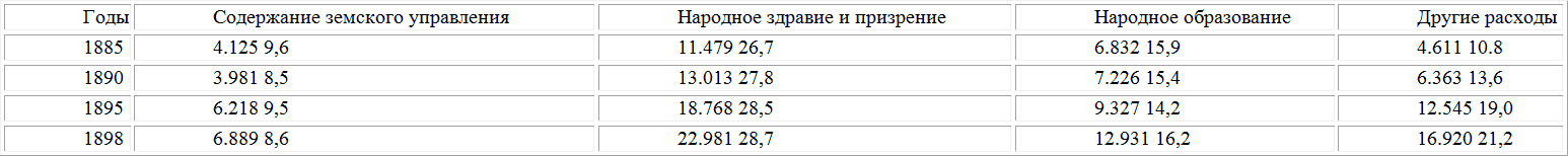 Второй отдел земских расходов (см. предыдущую подстрочную выноску) может быть подразделен на следующие пять главных категорий: 1) содержание земского управления, 2) народное здравие и общественное призрение, 3) народное образование, 4) разные другие расходы и 5) непредвиденные издержки. Оставляя в стороне последние, отношение которых к общему земскому бюджету колеблется весьма мало (от 2,3 до 2,5 %), интересно проследить изменения остальных поименованных выше земских расходов. Эти изменения показаны в следующей таблице, в которой верхние цифры за каждый год обозначают сумму расхода в тысячах рублей, а нижние – отношение ее ко всему бюджету земства в данном году.
