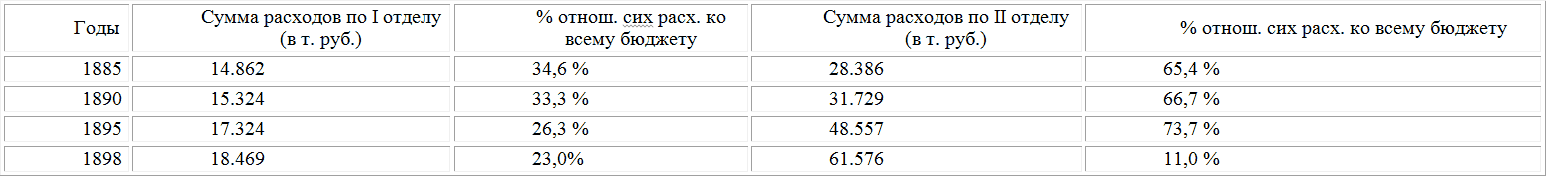 Если распределить все земские расходы по двум главным отделам, отнеся к первому отделу издержки на содержание местного гражданского управления (включая и подводную повинность) и суда (включая и содержание мест заключения), а также и дорожную повинность, а ко второму – расходы на содержание земского управления, народное здравие и общественное призрение, народное образование и все прочие чисто земские издержки, – то в составе первого отдела войдут исключительно обязательные земские расходы, а в состав второго – за маловажными исключениями расходы необязательные. С течением времени общая сумма издержек земских учреждений по этим двум отделам изменилась так: