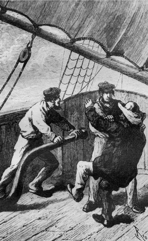 Около половины двенадцатого ночи до Джона Манглса и Вильсона, стоявших у борта с подветренной стороны, вдруг донесся какой-то необычный шум. Оба опытные моряки, они насторожились. Джон схватил матроса за руку.