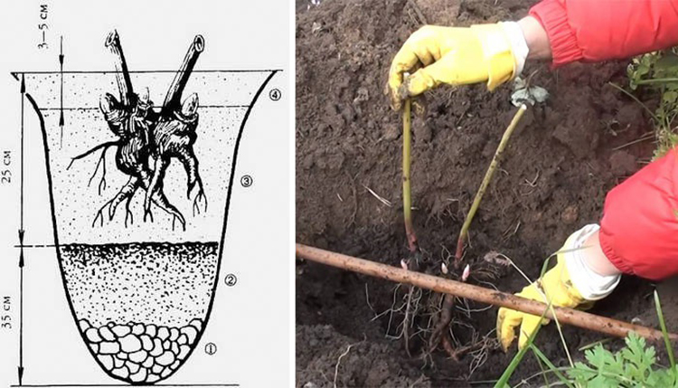 3. Готовим ямку так же, как при посадке пиона. Корневище помещаем строго по центру и засыпаем обычной землей без удобрений, чуть уплотняя. Получается, что пион посадили на питательную подушку.