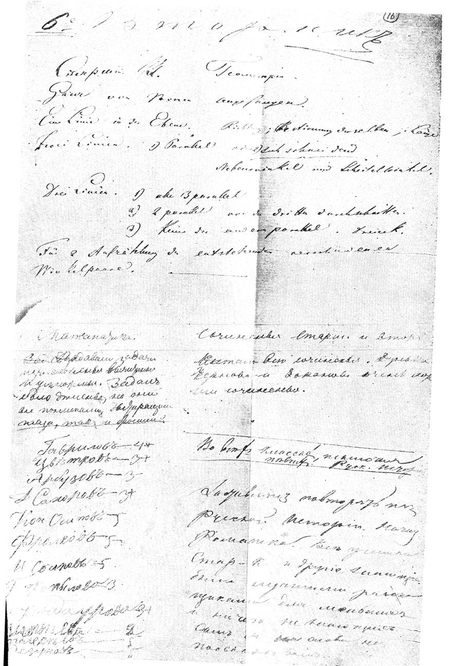 Самъ я пришелъ въ классъ по зову. Засталъ мальчиковъ занятыми своимъ дѣломъ по распоряженію Графа, который пришелъ еще до назначенныхъ часовъ въ росписаніи. – Румянцевъ писалъ изъ Русской Исторіи хорошо и много. Ванникова, Фокановъ и Ждановъ – изъ Св[ященной] Исторіи – тоже писали порядочно съ немногими грамматич[ескими] ошибками. —