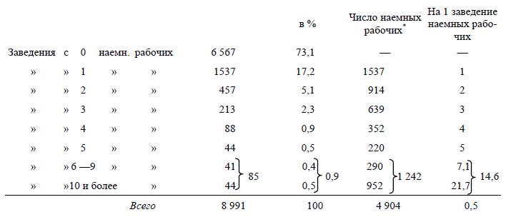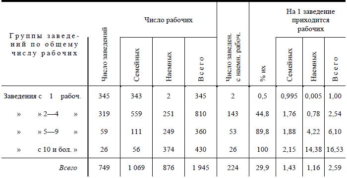 Посмотрим на данные переписи 1894/95 года о семейном и наемном труде. По числу семейных рабочих заведения распределяются так: