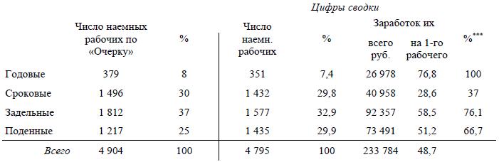 Все, что мы знаем из «Очерка» о наемных рабочих, это – деление их на 4 категории: годовые, сроковые, заделыцики и поденщики. Для ознакомления с этими категориями приходится обратиться к данным, разбросанным по книге. По 29 промыслам (из 43) указано число рабочих каждой категории и заработок их. В этих 29 промыслах 4795 наемных рабочих с заработком в 233 784 рубля. Во всех же 43 промыслах 4904 наемных рабочих с заработком в 238 992 руб. Значит, наша сводка обнимает 98% наемных рабочих и их заработка. Вот, en regard [181], цифры «Очерка» [182] и нашей сводки: