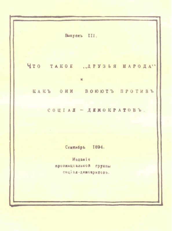 Обложка III выпуска гектографированного издания книги В. И. Ленина «Что такое «друзья народа» и как они воюют против социал-демократов?» – 1894 г. (Уменьшено)