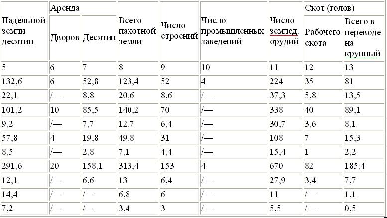 2) Графа 8-ая определена сложением числа десятин арендованной земли с числом десятин пахотной земли в составе надела (в сборнике есть такая графа).
