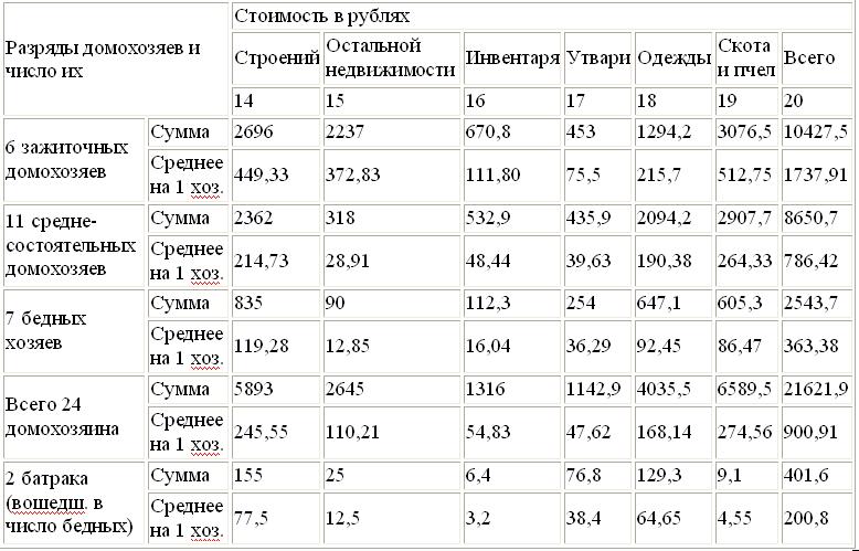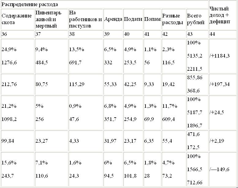 1) Первые 21 графа целиком взяты из сборника. Графа 22-ая соединяет графы сборника: от ржи, пшеницы, овса и ячменя, проса и гречи, остальных хлебов, картофеля, овощей и сена (8 граф). О том, как вычислялся доход от хлебов (23-ья графа) за исключением половы и соломы, говорено в тексте. Затем графа 24-ая соединяет графы сборника: от лошадей, рогатого скота, овец, свиней, птицы, кош и шерсти, сала и мяса, молочных продуктов, масла (9 граф). Графы 25–29 целиком взяты из сборника. Графы 30–34 соединяют графы сборника: издержки на рожь, пшеницу, пшено и гречу, картофель, овощи, соль, масло, сало и мясо, рыбу, молочные продукты, водку, чай (12 граф). Графа 35-ая соединяет графы сбор ника: на мыло, керосин, свечи, одежу и посуду (4 графы). Остальные графы ясны.