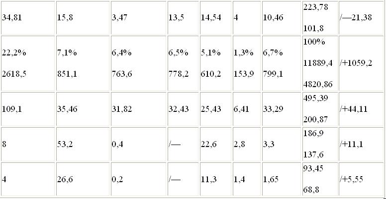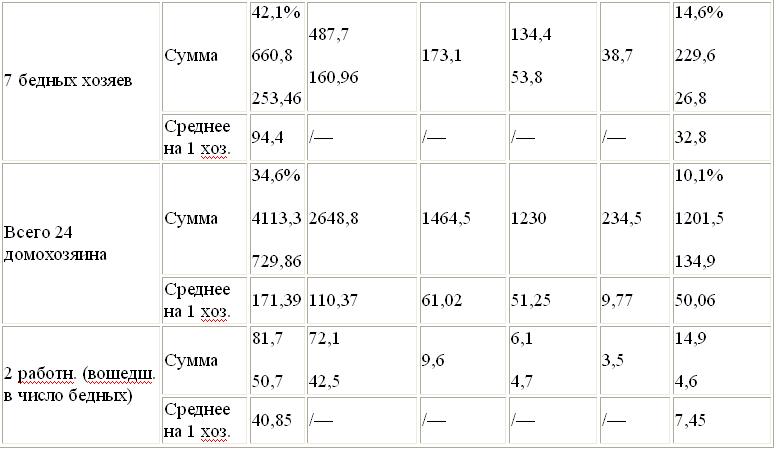 Привожу здесь в таблице данные о тех 24 бюджетах, о которых говорится в тексте. Свод данных о составе и бюджетах 24-х типичных крестьянских хозяйств по Острогожскому уезду.
