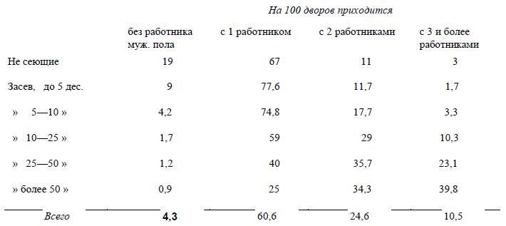Общую систему хозяйства крестьян этой группы Постников рисует так: «Домохозяева, имеющие у себя менее 4-х голов рабочего скота, обязательно спрягаются для обработки полей и посева. Домохозяева этого разряда имеют во дворе либо 2-х работников, либо одного. Уменьшение относительной рабочей способности таких хозяев следует уже в силу меньшего размера хозяйства, супряги и более скудного инвентаря. Пахота производится супряжниками часто малым, трехлемешным буккером, который работает медленнее. Если такие хозяева убирают хлеб машиною, нанимаемой у соседей, то они получают ее тогда, когда сосед успел уже скосить свой хлеб. При ручной уборке хлеба она долее тянется, в некоторых случаях требует найма поденных рабочих и дороже обходится. У хозяев одиноких всякое экстренное домашнее дело или исполнение общественных обязанностей прерывает работу. Если домохозяин-одиночка едет на полевые работы в дальнее поле, где крестьяне часто проводят целую неделю, зараз оканчивая посев и оранку, то он должен чаще возвращаться домой в село, чтобы навестить оставшуюся семью» (с. 278). Таких одиноких домохозяев (имеющих одного работника) в рассматриваемой группе большинство, как видно из следующей таблицы, приводимой Постниковым и показывающей рабочий состав семей в разных посевных группах по всем 3-м уездам Таврической губернии (с. 143).