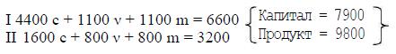 В основу исследования берется следующая схема [арабские цифры означают единицы ценности – миллионы рублей, например, а римские – указанные подразделения общественного производства. Норма прибавочной стоимости берется в 100 %]:
