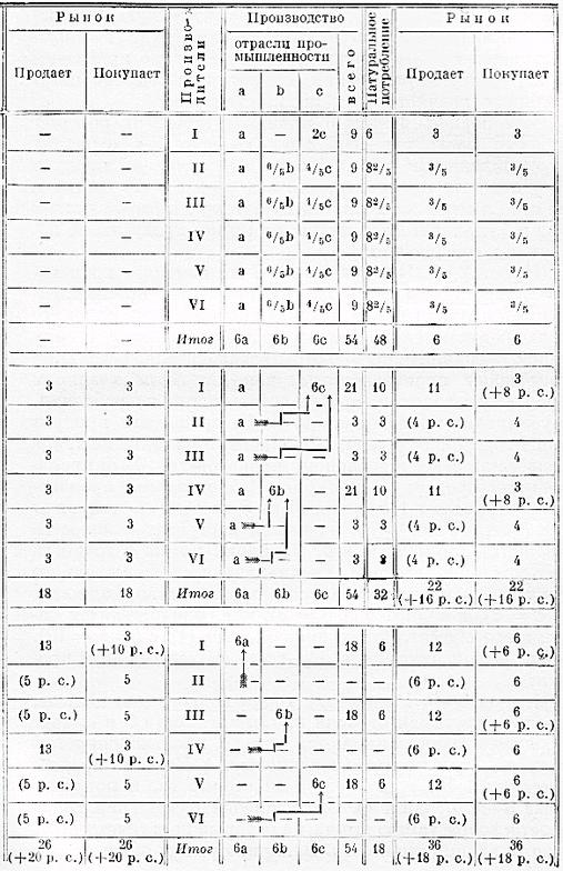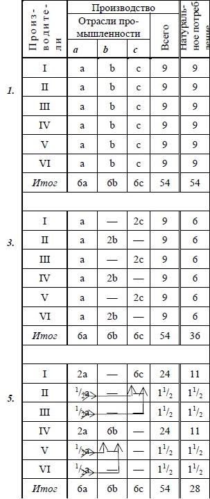 1-ый период. Имеем 6 производителей, из которых каждый расходует свой труд во всех 3-х отраслях промышленности (в а, в Ъ и в с). Получаемый продукт (9 у каждого производителя: а + b + с = 9) тратится на себя в своем же хозяйстве. Поэтому мы имеем чистый вид натурального хозяйства; на рынок продукты не поступают совершенно.