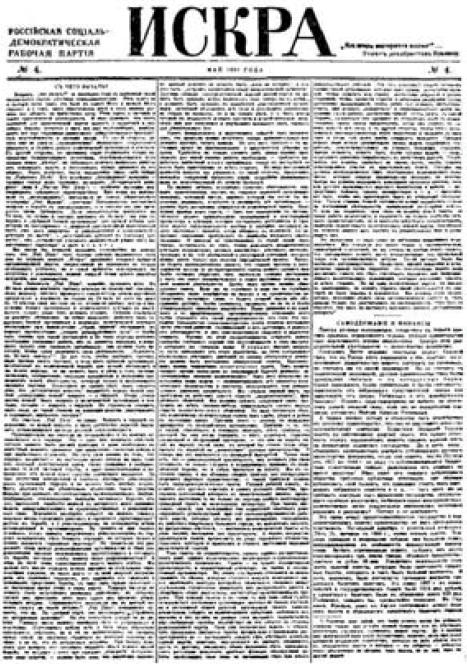 Первая страница газеты «Искра» № 4 со статьей В. И. Ленина «С чего начать?»– 1901 г. (Уменьшено)