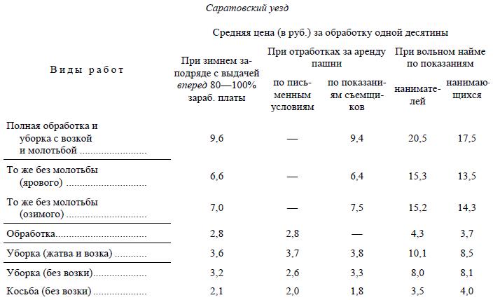 Переходим к вопросу об оплате труда при отработках. Данные из различных источников единогласно свидетельствуют о том, что оплата труда при отработочном и кабальном найме бывает всегда более низкая, чем при капиталистическом «вольном» найме. Во-1-х, это доказывается тем, что натуральные аренды, т. е. отработочные и испольные (выражающие, как мы сейчас видели, лишь отработочный и кабальный наем), по общему правилу везде дороже, чем денежные и притом значительно дороже (ibid., 350), иногда вдвое (ibid., 356, Ржевский уезд Тверской губ.). Во-2-х, натуральные аренды развиты всего сильнее в беднейших группах крестьян (ibid., 261 и следующие). Это – аренды из нужды, «аренды» крестьянина, который уже не в силах сопротивляться превращению его таким образом в сельскохозяйственного наемного рабочего. Состоятельные крестьяне стараются снимать землю за деньги. «Наниматель пользуется малейшей возможностью вносить арендную сумму деньгами и тем удешевить стоимость пользования чужой землей» (ibid., 265) – и не только удешевить стоимость аренды, добавим от себя, но также и избавиться от кабального найма. В Ростовском-на-Дону уезде был констатирован даже такой замечательный факт, как переход от денежной аренды к скопщине{67} по мере увеличения арендных цен, несмотря на уменьшение доли крестьян в скопщине (стр. 266, ibid.). Значение натуральных аренд, которые окончательно разоряют крестьянина и превращают его в сельского батрака, иллюстрируется этим фактом вполне наглядно[142]. В-3-х, прямое сравнение цен на труд при отработочном и капиталистическом «вольном» найме показывает более высокий уровень последних. В цитированном издании департамента земледелия: «Вольнонаемный труд и т. д.», рассчитывается, что средней платой за полную обработку крестьянским инвентарем одной десятины озимого хлеба надо считать 6 руб. (данные о средней черноземной полосе за 8 лет, 1883–1891). Если же рассчитать стоимость тех же работ по вольному найму, то получим 6 р. 19 к. только за пеший труд, не считая работы лошади (плату за работу лошади невозможно положить менее 4 р. 50 к., 1. с., 45). Составитель справедливо считает такое явление «совершенно ненормальным» (ibid.). Заметим только, что более высокая оплата труда при чисто капиталистическом найме, сравнительно со всяческими формами кабалы и других докапиталистических отношений, есть факт, установленный не только для земледелия, но и для промышленности, не только для России, но и для других стран. Вот более точные и более подробные данные земской статистики по этому вопросу («Сборник стат. свед. по Саратовскому уезду», т. I, отд. III, стр. 18–19. Цитир. по «Арендам» г. Карышева, стр. 353):