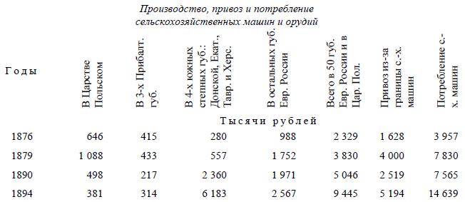 О производстве сельскохозяйственных машин и орудий в России не имеется, к сожалению, таких полных и точных данных. Неудовлетворительность нашей фабрично-заводской статистики, смешение производства машин вообще с производством именно сельскохозяйственных машин, отсутствие каких бы то ни было твердо установленных правил о разграничении «фабрично-заводского» и «кустарного» производства сельскохозяйственных машин, – все это не дает возможности представить полную картину развития сельскохозяйственного машиностроения в России. Сводя вместе те данные, которые имеются в вышеназванных источниках, получаем такую картину развития сельскохозяйственного машиностроения в России: