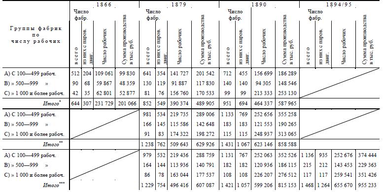 Доказанная выше неудовлетворительность данных нашей фабрично-заводской статистики заставила нас прибегнуть к более сложным подсчетам для определения того, как развивалась после реформы крупная машинная индустрия в России. Мы сделали выборку данных за 1866, 1879, 1890 и 1894/95 гг. о крупнейших фабриках, именно: имеющих 100 и более рабочих в заведении[598]. Рабочие на стороне строго отделены только в данных «Перечня» за 1894/95 г.; поэтому возможно, что за прежние годы (особенно 1866 и 1879) данные остались все же несколько преувеличенными, несмотря на те исправления, о которых сказано в примечании.