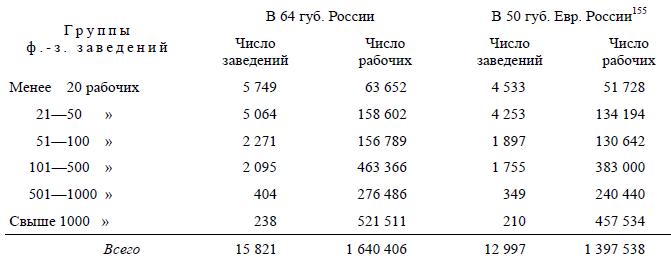 В горной промышленности концентрация рабочих в крупных предприятиях еще сильнее (хотя процент предприятий, применяющих к производству паровые двигатели, ниже); 258 тыс. рабочих из 305 тыс., т. е. 84,5 % горнорабочих сосредоточены в предприятиях с 100 и более рабочих; почти половина горнорабочих (145 тыс. из 305 тыс.) занята на немногочисленных крупнейших заводах, имеющих по 1000 и более рабочих. Из всего же числа фабрично-заводских и горных рабочих Европейской России (1180 тыс. в 1890 г.) три четверти (74,6 %) сосредоточены в предприятиях, имеющих 100 и более рабочих; почти половина (570 тыс. из 1180) сосредоточена в предприятиях, имеющих по 500 и более рабочих[603].