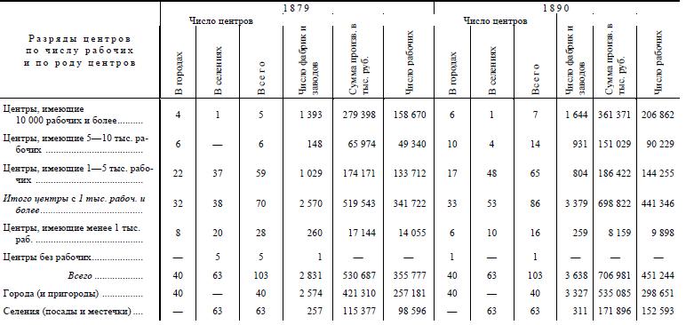 Кроме вопроса о концентрации производства на крупнейших заведениях для характеристики крупной машинной индустрии важен еще вопрос о концентрации производства в отдельных центрах фабрично-заводской промышленности и о различных видах фабричных центров. К сожалению, наша фабрично-заводская статистика не только дает неудовлетворительный и несравнимый материал, но и разрабатывает его далеко недостаточно: напр., в современных изданиях размещение промышленности показывается лишь по целым губерниям (а не по городам и уездам, как это сделано в лучших изданиях 60-х годов, которые иллюстрировали также размещение фабрично-заводской промышленности картами). Но для того, чтобы дать точное представление о размещении крупной промышленности, необходимо взять данные по отдельным центрам, т. е. по отдельным городам, фабричным поселкам или группам фабричных поселков, расположенных на близком расстоянии друг от друга; губернии же или уезды – слишком крупные территориальные единицы[607]. Ввиду этого мы сочли необходимым подсчитать из «Указателей» за 1879 и 1890 годы данные о концентрации нашей фабрично-заводской промышленности в важнейших центрах. В таблицу, помещаемую в приложении (приложение III), вошли данные о 103 фабричных центрах Европейской России, сосредоточивающих около половины всего числа фабрично-заводских рабочих[608].