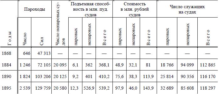 Коммерческий флот России состоял в 1868 г. из 51 парохода, вместимостью в 14,3 тыс. ластов{105}, и из 700 парусных судов, вместимостью в 41,8 тыс. ластов, а в 1896 г. – из 522 пароходов, вместимостью в 161,6 тыс. ластов[683].