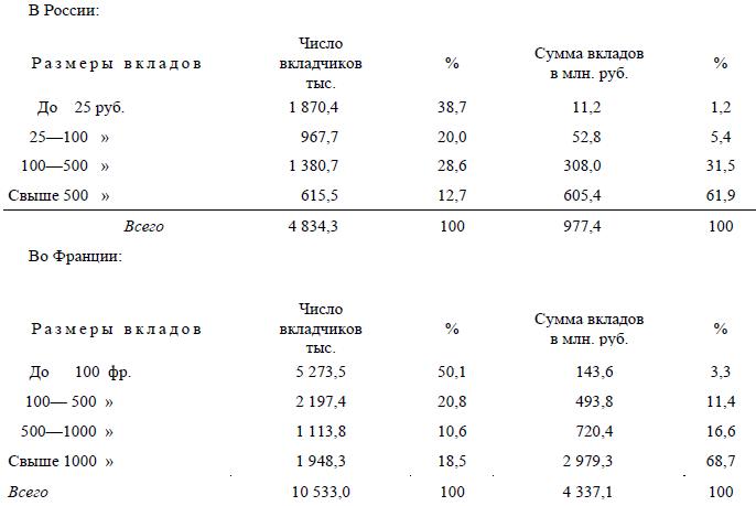 Новейшие сведения показывают еще большее развитие сберегательных касс. В 1904 г. во всей России их было 6557, число вкладчиков – 5,1 млн., общая сумма вкладов – 1105,5 млн. руб. Кстати. У нас и старые народники и новые оппортунисты в социализме не раз говорили большие (выражаясь мягко) наивности о росте сберегательных касс, как признаке «народного» благосостояния. Нелишне, пожалуй, поэтому сравнить распределение вкладов в эти кассы в России (1904) и во Франции (1900— сведения из «Bulletin de L’Office du travail», 1901, № 10).