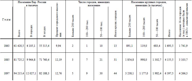 Население городов, представляющих из себя крупные индустриальные и торговые центры, растет гораздо быстрее, чем население городов вообще. Число городов, имеющих 50 и более тысяч жителей, более чем утроилось с 1863 по 1897 г. (13 и 44). В 1863 г. из всего числа горожан лишь около 27 % (1,7 млн. из 6,1) было сосредоточено в таких крупных центрах; в 1885 г. около 41 % (4,1 млн. из 9,9)[693], а в 1897 г. уже более половины, около 53 % (6,4 млн. из 12 млн.). Таким образом, если в 60-х годах характер городского населения определялся преимущественно населением не очень больших городов, то в 1890-х годах крупные города достигли полного перевеса. Население 14 городов, которые были самыми крупными в 1863 г., возросло с 1,7 млн. жителей до 4,3 млн., т. е. на 153 %, тогда как все городское население увеличилось лишь на 97 %. Следовательно, громадный рост крупных индустриальных центров и образование целого ряда новых центров есть один из характернейших симптомов пореформенной эпохи.
