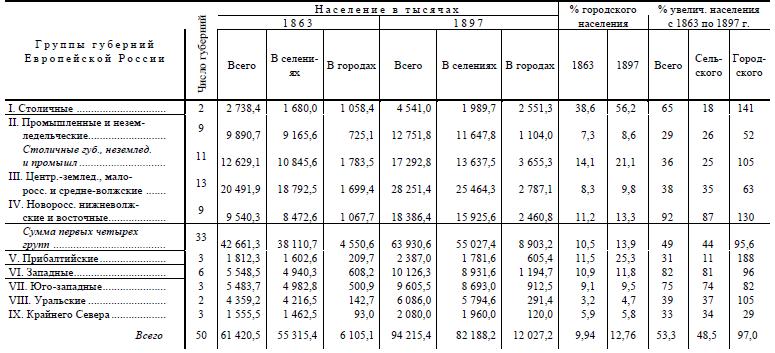 Пореформенная Россия показывает нам именно одновременное проявление обоих процессов. В начале пореформенной эпохи в 60-х годах южные и восточные окраины Европейской России были в значительной степени незаселенной территорией, на которую направлялся громадный приток переселенцев из центральной земледельческой России. Это образование нового земледельческого населения на новых землях и затемняло до известной степени идущее параллельно с этим отвлечение населения от земледелия к промышленности. Чтобы наглядно представить описываемую особенность России по данным о городском населении, необходимо разбить 50 губерний Европейской России на отдельные группы. Приводим данные о городском населении в 9-ти районах Европейской России в 1863 и в 1897 гг. [см. таблицу на стр. 565. Ред.].