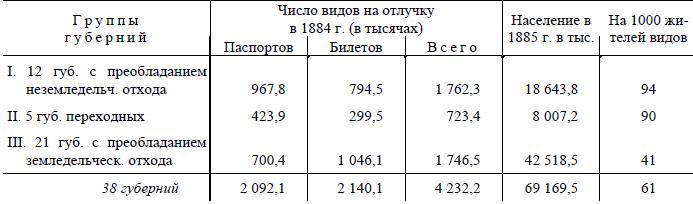 «Эти цифры показывают, что отхожие промыслы сильнее развиты в первой группе, чем в третьей… Затем из приведенных цифр видно, что соответственно различию групп разнообразится и самая продолжительность отлучек на заработки. Там, где преобладают неземледельческие отхожие промыслы, продолжительность отлучек оказывается гораздо значительнее» («Дело», 1886, № 7, с. 134).