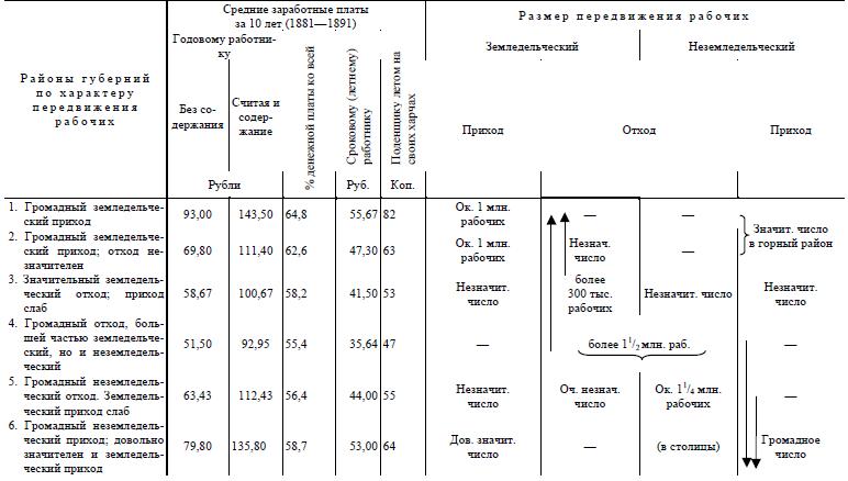 Главнейшие передвижения неземледельческих рабочих: 1) В столицы и в большие города главным образом из неземледельческих, но в значительной степени и из земледельческих губерний. 2) В промышленный район на фабрики Владимирской, Ярославской и других губерний из тех же местностей. 3) Передвижение к новым центрам промышленности или к новым отраслям ее, к центрам промышленности нефабричной и пр. Сюда относится движение: а) на свеклосахарные заводы юго-западных губерний; б) в южный горный район; в) на портовые работы (в Одессу, Ростов н/Д., Ригу и пр.); г) на разработку торфа во Владимирской и других губерниях; д) в Уральский горнопромышленный район; е) на рыбные промыслы (в Астрахань, к Черному и Азовскому морям и пр.); ж) на судовые, судоходные работы, на вырубку и сплав леса и т. п.; з) на работы железнодорожные и т. д.