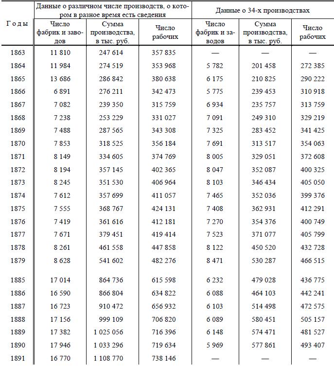 1) Здесь сведены данные о фабрично-заводской промышленности Европейской России за пореформенную эпоху, которые мы могли найти в официальных изданиях, каковы: «Статистический временник Российской империи». СПБ. 1866. I. – «Сборник сведений и материалов по ведомству мин-ва фин.». 1866 г. № 4, апрель, и 1867 г. № 6, июнь. – «Ежегодник министерства фин.». Вып. I, VIII, Х и XII. – «Свод данных о фабрично-заводской промышленности России», изд. департамента торг. и мануф. за 1885–1891 годы. Все эти данные основаны на одном и том же источнике, именно на ведомостях, доставляемых фабрикантами и заводчиками в м-во финансов. О значении этих данных и достоинстве их подробно сказано в тексте книги.