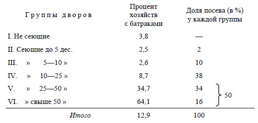 Концентрация земледельческого производства оказывается очень значительной: «общинные» капиталисты (1/14 всего числа дворов, именно дворы с 10 и более головами рабочего скота) имеют 36,5 % всего посева – столько же, сколько и 75,3 % всего бедного и среднего крестьянства, вместе взятого! «Средняя» цифра (15,9 дес. посева на 1 двор) является и здесь, как всегда, совершенно фиктивной, создавая иллюзию общего довольства. Посмотрим на другие данные о хозяйстве разных групп.