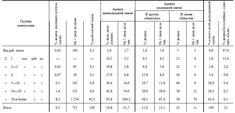 Но как могла создаться такая крупная буржуазия в земледельческом общинном хозяйстве? Ответ дают цифры землевладения и землепользования по группам. Всего у крестьян взятого нами подразделения имеется 57 128 дес. купчей земли (у 76 дворов) и 304 514 дес. арендованной земли, в том числе 177 789 дес. вненадельной аренды у 5602 дворов; 47 494 дес. арендованной надельной земли в других обществах у 3129 дворов и 79 231 дес. арендованной надельной земли в своем обществе у 7092 дворов. Распределение этой громадной площади, составляющей более 2/3 всей посевной площади крестьян, таково: [см. таблицу на стр. 80. Ред.]