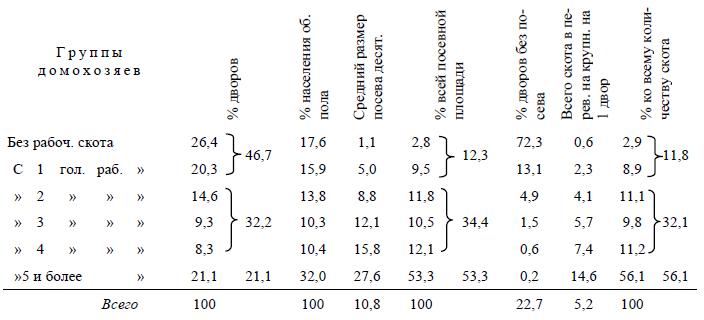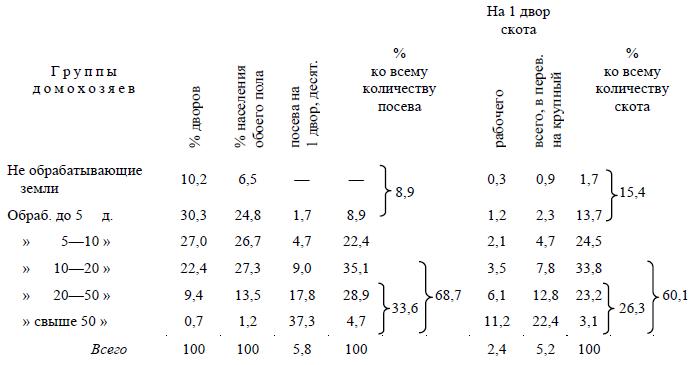 И здесь, следовательно, несмотря на значительно меньшие размеры посева, мы видим те же самые отношения между группами, ту же концентрацию посева и скота в руках небольшой группы зажиточного крестьянства Отношение между землевладением и действительным хозяйственным пользованием землей оказывается и здесь таким же, как в знакомых уже нам губерниях[68].