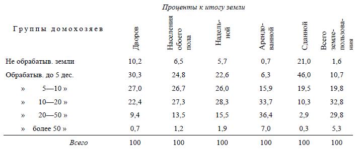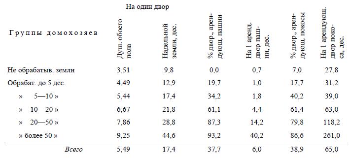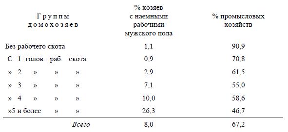 Возвращаясь к нашей табличке, заметим, что мы имели все же известное право отнести «промыслы» на счет продажи рабочей силы, ибо наемные рабочие преобладают обыкновенно среди крестьянских «промышленников». Если бы можно было выделить из последних одних наемных рабочих, то мы получили бы, конечно, несравненно меньший процент «промышленников» в высших группах.