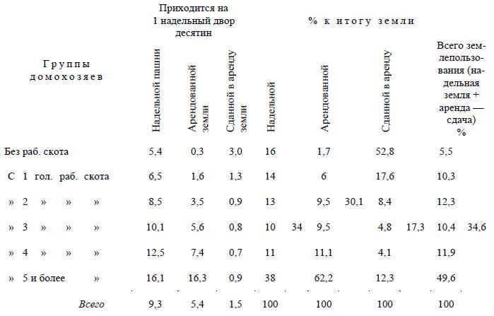 Таким образом и здесь мы видим, что чем зажиточнее крестьянство, тем больше оно арендует, несмотря на большую обеспеченность его надельной землей. И здесь мы видим, что зажиточное крестьянство оттесняет среднее и что роль надельной земли в крестьянском хозяйстве имеет тенденцию уменьшаться на обоих полюсах деревни.