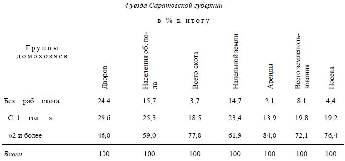 Сравним теперь Камышинский уезд с другими уездами Саратовской губернии. Отношения между группами крестьян везде однородны, как показывают нижеследующие данные по тем 4-м уездам (Вольскому, Кузнецкому, Балашовскому и Сердобскому), в которых соединено, как мы сказали, среднее и зажиточное крестьянство: