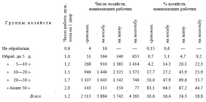 Что касается данных о наемных рабочих, то мы должны отметить здесь полную ошибочность мнения г. Харизоменова, будто «краткосрочный наем [рабочих] на жнитво, покос и поденщину, составляя слишком распространенное явление, не может служить характерным признаком силы или слабости хозяйства» (стр. 46 «Введения» к «Своду»). И теоретические соображения, и пример Западной Европы, и русские данные (о них ниже) заставляют, напротив, видеть в найме поденных рабочих весьма характерный признак сельской буржуазии.