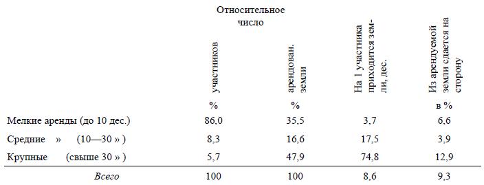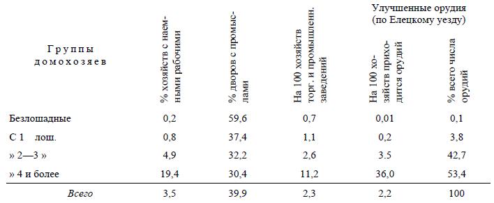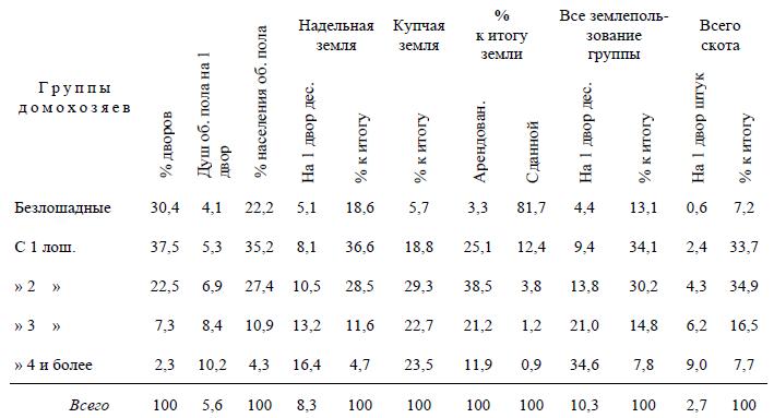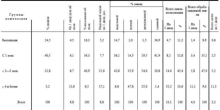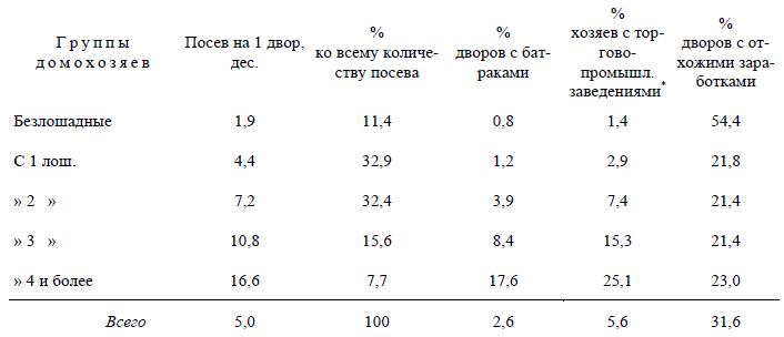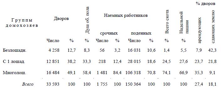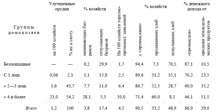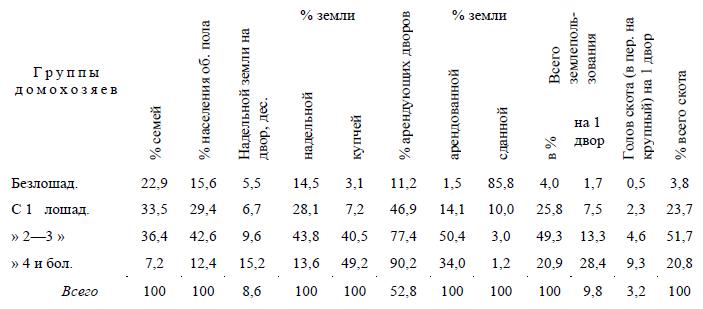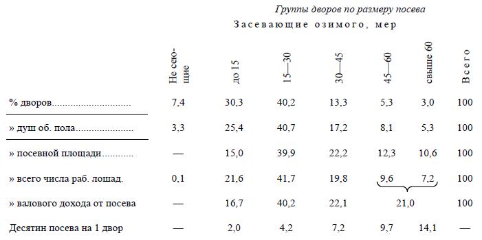 То есть, у 21,6 % дворов, при 30,6 % населения, – 36,6 % рабочие лошадей, 45,1 % посева, 43,1 % валового дохода от посевов. Ясно, что и эти цифры говорят о концентрации купчей и арендованной земли зажиточным крестьянством.