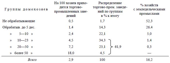 Данные о «промыслах» позволяют нам на этот раз выделить два основных типа «промыслов», знаменующие 1) превращение крестьянства в сельскую буржуазию (владение торгово-промышленным заведением) и 2) превращение крестьянства в сельский пролетариат (продажа рабочей силы, так называемые «земледельческие промыслы»). Вот распределение по группам этих «промышленников» диаметрально противоположного типа[69]: