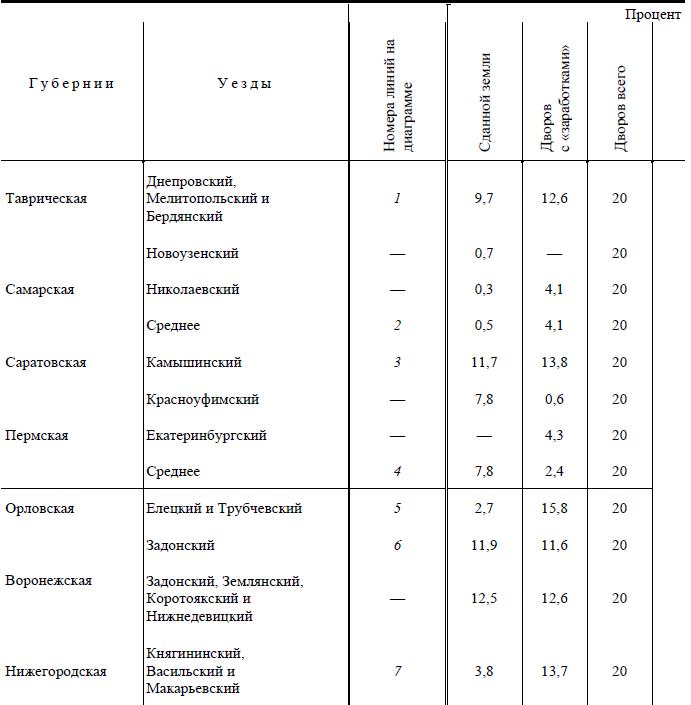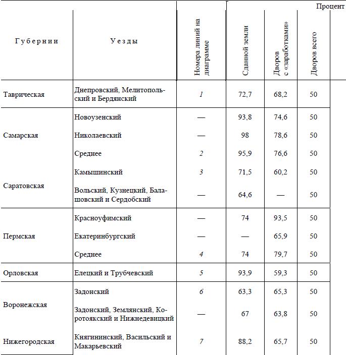 3. По обоим уездам Самарской губернии вместо процента сданной земли взят процент сдающих надел бесхозяйных дворов.