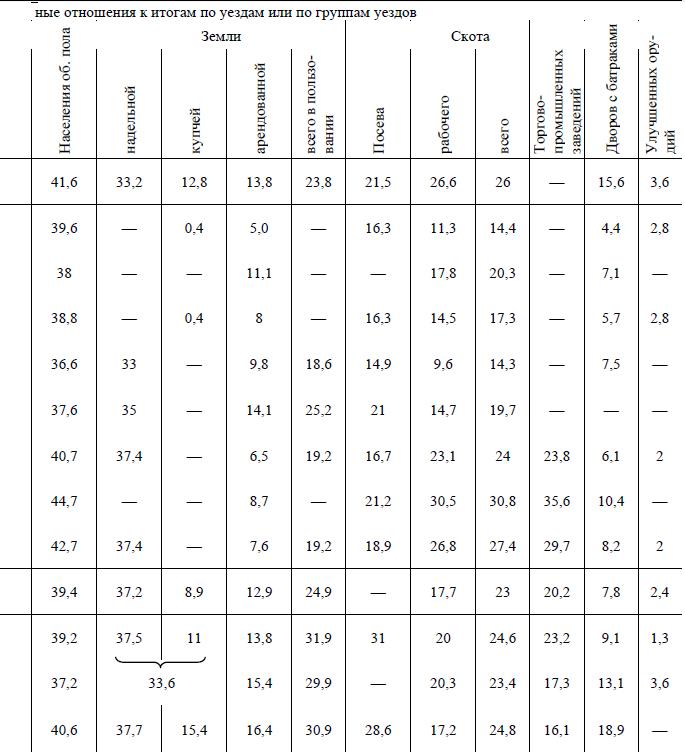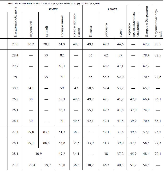 Для суждения о взаимоотношении групп мы берем следующие данные, имеющие наибольшую важность в вопросе о разложении: 1) число дворов; 2) число душ обоего пола крестьянского населения; 3) количество земли надельной; 4) купчей; 5) арендованной; 6) сданной в аренду; 7) всего землевладения или землепользования группы (надельная земля + купчая + аренда – сдача); 8) посева; 9) рабочего скота; 10) всего скота; 11) дворов с батраками; 12) дворов с заработками (выделяя, по возможности, те виды «заработков», среди которых преобладает работа по найму, продажа рабочей силы); 13) торгово-промышленных заведений, и 14) улучшенных земледельческих орудий. Отмеченные курсивом данные («сдача земли» и «заработки») имеют отрицательное значение, показывая упадок хозяйства, разорение крестьянина и превращение его в рабочего. Все остальные данные имеют положительное значение, показывая расширение хозяйства и превращение крестьянина в сельского предпринимателя.